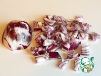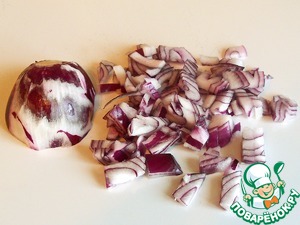 Для этого салата лук нужно выбрать неострый, причём. чтобы салат смотрелся интереснее, лук лучше взять красный. Режем лук довольно мелко, на "шашечки". Выкладываем в миску и сразу же поливаем уксусом, перемешиваем.