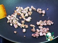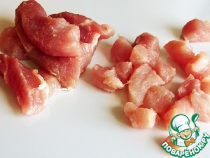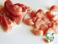 Мясо режем на небольшие кубики, слегка отбиваем, посыпаем молотым чёрным перцем (немного). Вместо мяса можно использовать мясную часть бекона, нежирную ветчину.