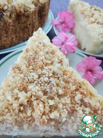 Сверху начинки посыпаем равномерно вторую половину крошки. И ставим в разогретую духовку t 180 градусов. Готовится «королевская ватрушка» около 40 минут, пока не станет румяной.