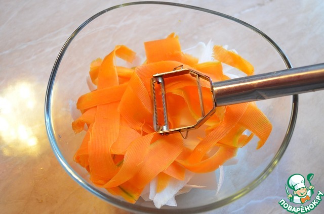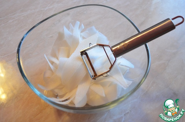 Первый наш осенний ингредиент - дайкон, почистить и нарезать при помощи овощечистки, длинными лентами.
