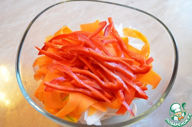 Третий наш осенний ингредиент - сладкий красный перец, который нужно нарезать тонкими полосками.