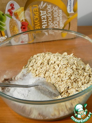 В миске смешать хлопья, сахар, какао, муку и разрыхлитель.