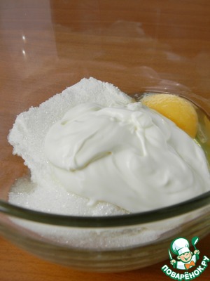 К творогу добавить яйцо, сахар, сметану и ванилин. Перемешать.