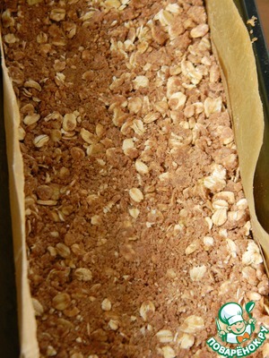 Форму застелить бумагой для выпечки, выложить половину овсяной крошки, немного примять.