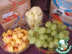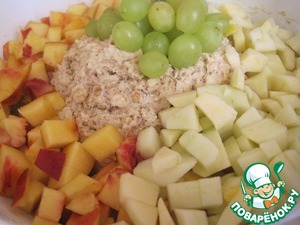 Подготовленные нектарины (без косточек) и яблоки (без кожицы) режем кубиками, виноград снимаем с веточки.