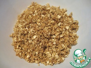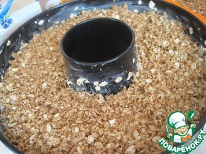 Тесто готово. Включаем духовку на разогрев t 180-190 градусов. Разъёмную форму смазываем сливочным маслом и посыпаем овсяными хлопьями.