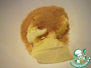 Для теста взобьём миксером размягчённое масло с коричневым сахаром и ванилином до пышности.