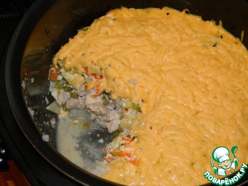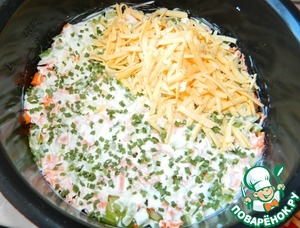 • Посыпаем зеленым луком и натертым сыром. Готовим в режиме "Выпечка" 50 минут.