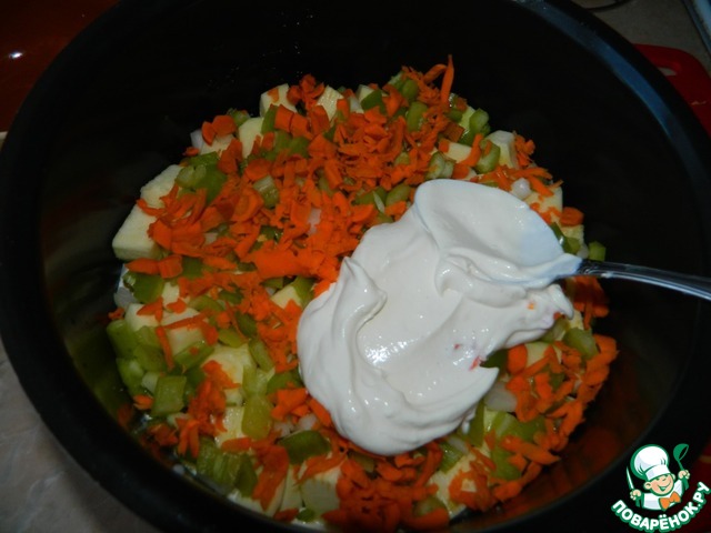 • Затем слой из тертой моркови и болгарского перца. Затем снова слой сметаны. Солим, перчим...