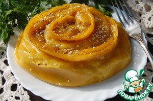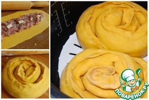 Разделитьтесто на 2 части. Скатать руками 2 колбаски и раскатать каждую из них скалкой. На центр каждой полоски выложить начинку по всей длине и аккуратно защипить края. Свернуть полоски по спирали. Круг для приготовления на пару смазать растительным маслом и выложить на него наши завитки. Готовить в течении 40 минут. Перед подачей завитки полить растопленным сливочным маслом.