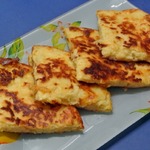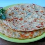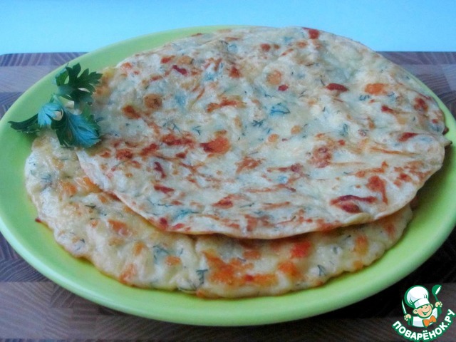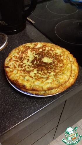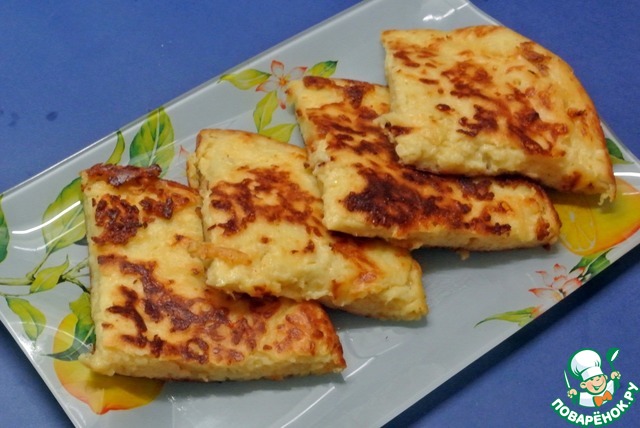 На сковородку (диаметр 20-22 см) налить растительное масло, слегка прогреть, выложить сырную массу. Жарить на огне чуть меньше среднего под крышкой 5-7 минут, затем перевернуть лепешку на другую предварительно разогретую сковородку, продолжить процесс приготовления еще 5-7 минут. Лепешка хороша как горячей, так и остывшей.