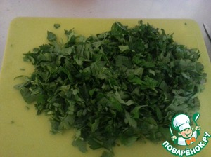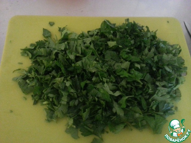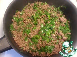 Когда фарш готов, солим, перчим, добавляем специи и петрушку, обжариваем еще 1 минуту. Оставляем остывать.