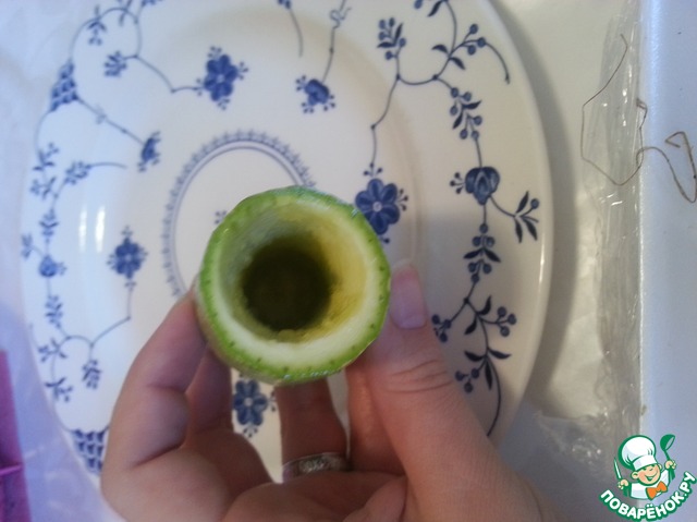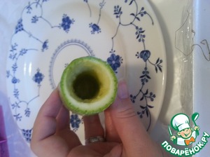 Теперь займемся цуккини. Моем, если у вас большие цуккини, чистим от кожуры и разрезаем пополам. Далее вынимаем сердцевину.