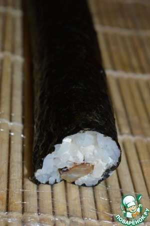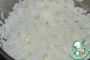 Рис промыть. Залить водой и дать закипеть, затем накрыть крышкой и убавить огонь. Варить 20 минут. Затем дать постоять 10 минут. Перемешать, заправить рисовым уксусом и снова перемешать. Дать остыть.