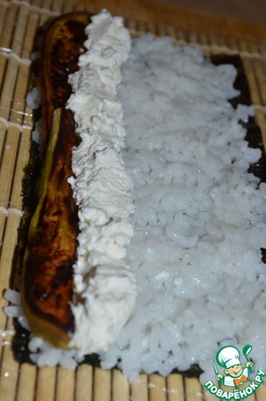 Лист нори разрезать пополам. На одну половину выложить рис, полоски баклажана и сливочный сыр.