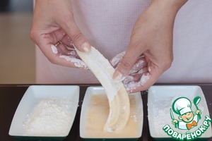 Бананы разрезаем вдоль на 2 части и по очереди окунаем сначала в крахмал, затем в яйцо и, в последнюю очередь, в муку.