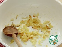 Грудку нарезать полосками и лук четверть кольцами. Лук обжарить до золотистого цвета с ложкой оливкового масла.
