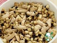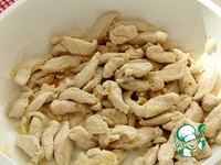 К луку добавить куриную грудку. Обжарить до полуготовности. |