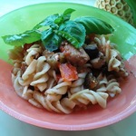Пока баклажан отдыхает, отварить макароные изделия аль-денте ( смотреть на упаковке). Я брала фузили, но здесь можно и бантики и пенне, только не большие и не спагетти. |