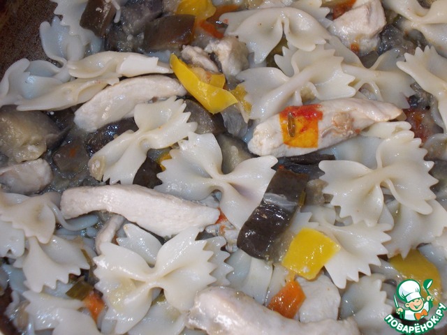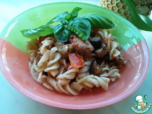 Тушить до готовности баклажанов и добавить макаронные изделия. Добавить черри и оставить на огне не более 5мин. Подавать горячим. Перед подачей посыпать свежим базиликом. |
