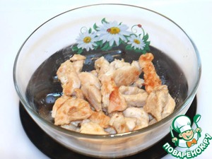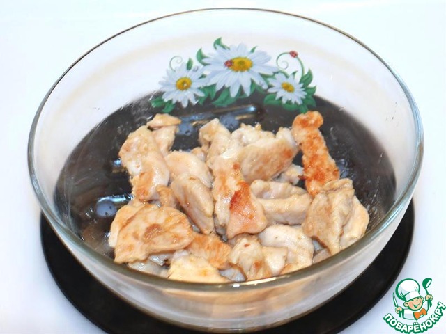 • Филе куриное нарезать тонкими полосками, посолить, можно добавить приправу для курицы и перемешать.