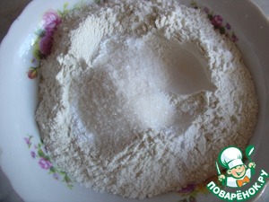 3)Муку смешиваем с разрыхлителем, сахаром, солью перемешиваем венчиком.