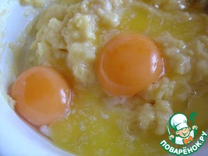 4)Когда Хлопья пшенные не требующих варки"Мистраль" впитает всю воду и остынет до комнатной температуры (на это уйдет 1-2 минуты), перекладываем их в большую миску. Туда же разбиваем два яйца. Добавляем растопленное и охлажденное до комнатной температуры сливочное масло, хорошенько взбиваем.
