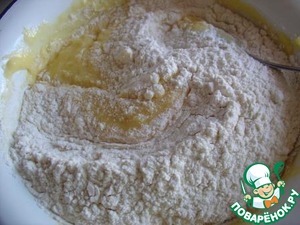 5)Добавляем в миску сухую мучную смесь и взбиваем, пока сухие ингредиенты не перемешаются с жидкими.