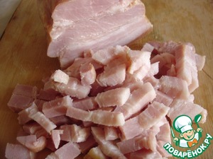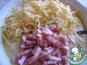 9)Теперь самое интересное. Добавляем в тесто кусочки бекона. Туда же добавляем крупно тертый сыр. Хорошенько перемешиваем - и тесто готово.