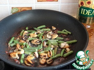 Мидии и фасоль обжарить на масле на раскаленной сковороде с добавлением соли и рубленного чеснока.
