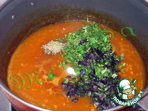 Зелень помыть, просушить и измельчить, добавить к алыче. Приправить специями, солью и сахаром.
