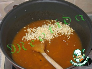 Положить в кастрюльку с толстым дном, положить измельченный чеснок, накрыть крышкой и оставить на маленькой огне на 1 час, томиться. Иногда надо помешивать.