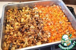 Тыкву и баклажан нарезать небольшими кусочками. Выложить на глубокий противень, не перемешивать!