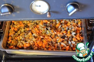 По истечении времени запекания достать противень, перемешать все овощи.