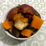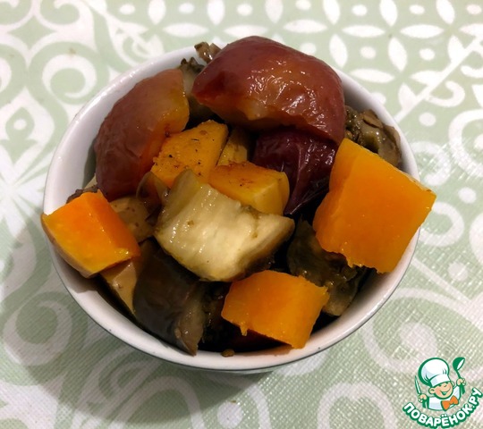 Перемешать овощи (баклажаны перемешать с луком, а тыкву с яблоком и чесноком, но саму тыкву с баклажаном не перемешивать). Запекаем в духовке 45 минут при 190 градусах.