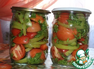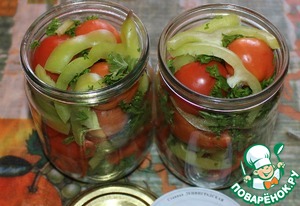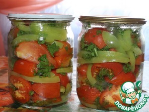 В стерилизованные баночки укладываем помидоры (если крупные, то режем на четвертинки, если не большие, то половинками)чередуя с перцем и зеленью.