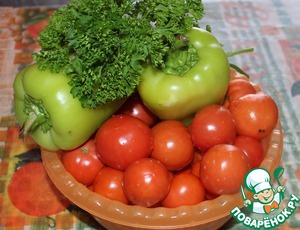 Помидоры"Диетические" ингредиенты Перец очищаем от сердцевины и нарезаем полукольцами или кольцами (кому как нравится). Зелень мелко режем.