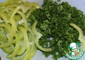 Перец очищаем от сердцевины и нарезаем полукольцами или кольцами (кому как нравится). Зелень мелко режем.