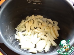В программе "жарка" пассеровать рубленный лук на масле - 2-3 минуты;