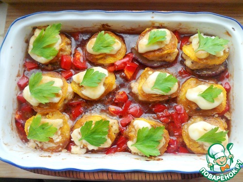 На помидор положить плавленый сыр и запечь в духовке 20-25 минут при температуре 180 градусов.