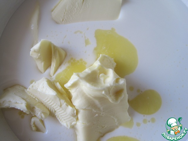 Нагреем молоко и растопим в нём сливочное масло. Остудим смесь до тёплого состояния, что б не загубить дрожжи.