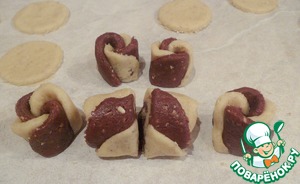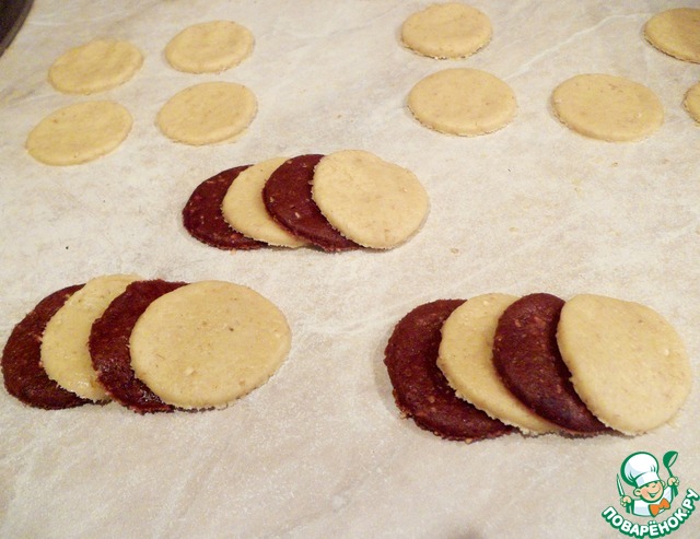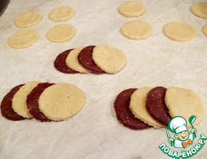 Раскатать оба куска теста и рюмкой вырезать кружочки.