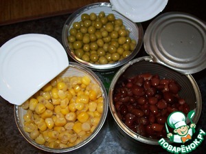 открыли банки с фасолью, горошком и кукурузой, слили жидкость, высыпали содержимое в салатник. -