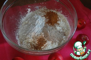 Смешать просеянную муку с корицей, мускатным орехом и гвоздикой. Добавить разрыхлитель и хорошо перемешать.