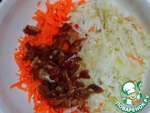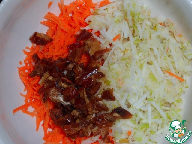 Потереть на терку морковь, яблоко. Порезать мелко финики. Добавить сок половины лимона.