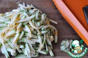 Цуккини нарезаем тонкими полосками или натираем на тёрке Бёрнер.