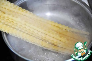 Одновременно берём тальятелле или любой другой вид пасты (макаронных изделий) и отвариваем согласно инструкции на упаковке в подсоленной воде.