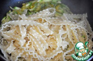 Тальятелле откидываем на дуршлаг, кладём на сковороду к цуккини. Перемешиваем.