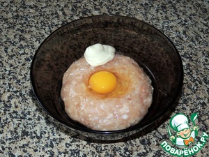 В готовый фарш добавить яйцо и майонез, перемешать.
