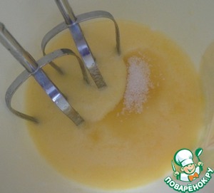 Смешиваем кефир с растительным маслом и перемешиваем. Затем добавляем яйцо, соду и сахар, ванилин.